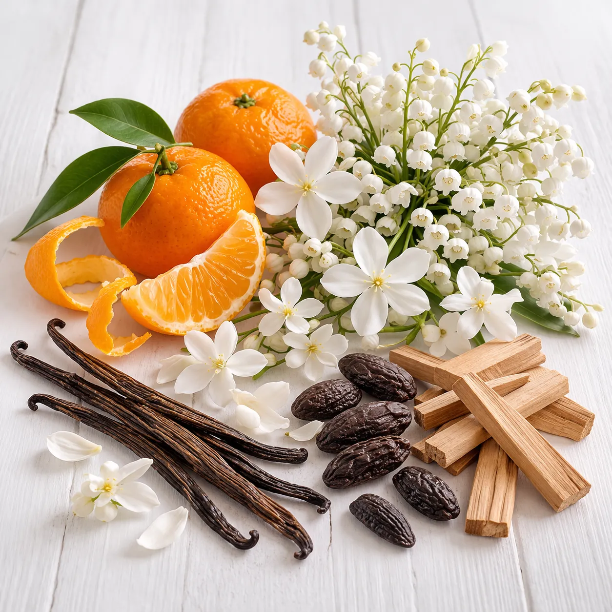 A warm, alluring fragrance with soft citrus brightness and a deep, woody elegance.